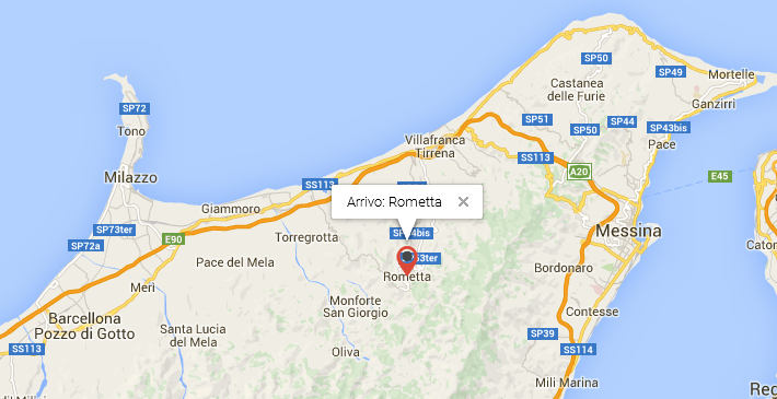 A20 ME-PA, percorrendo per circa 11 Km la S.P. 56 che dalla frazione tirrenica di Rometta Marea s’inerpica sino all’antica città-castello di Rometta.